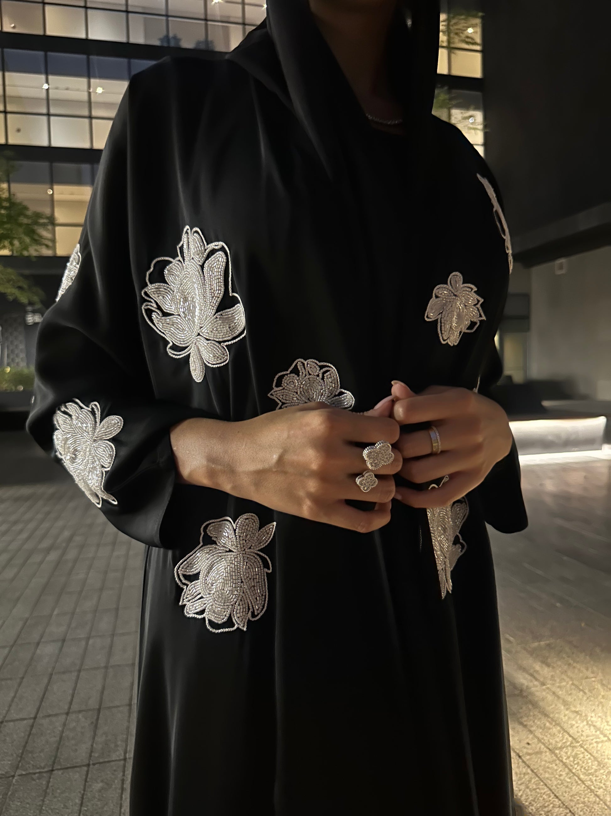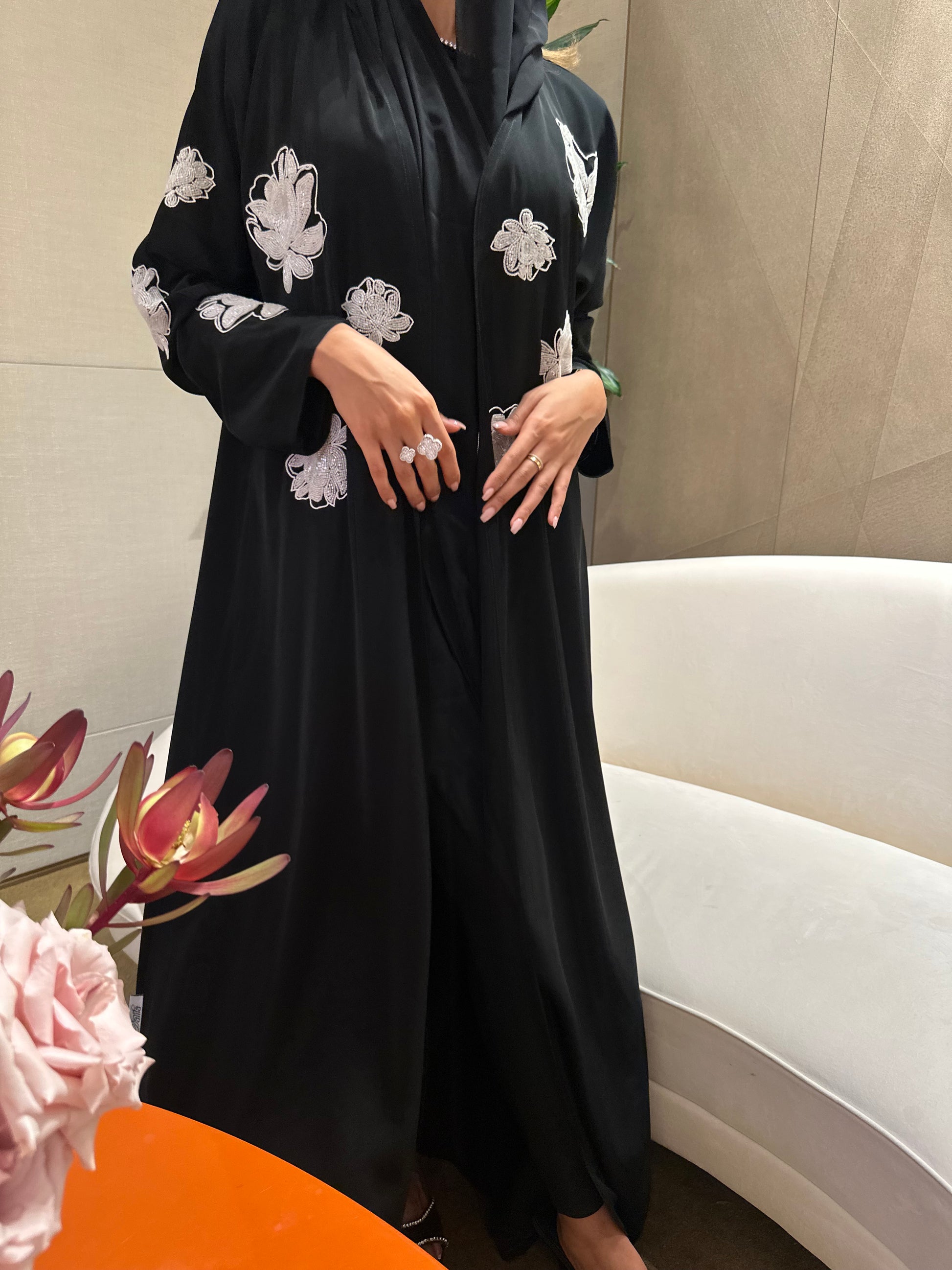 Klosh abaya with a silky and light nada fabric and stunning hand embroidered and beaded flowers